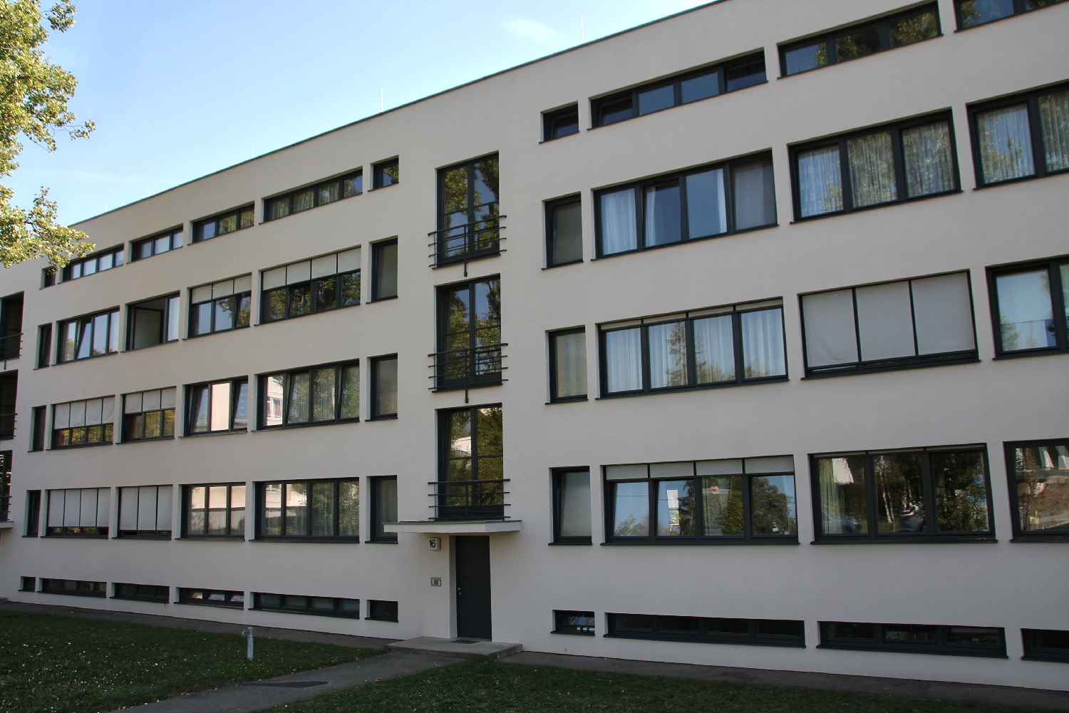 Auch hier wieder Lichtbänder und Stahlfenster und was man bis dahin auch nicht kannte, war, dass die Fenster nach außen zu öffnen sind. Dadurch sparte man Platz und konnte Möbel besser stellen. Ausserdem drückte der Wind die Fenster zu. Oud war Holländer und vielfach waren die Fenster in Holland nach außen zu öffen und auch hier wieder Stahlrahmenfenster Auch hier ist alles noch im Originalzustand. Eine Bewohnerin sagte mir, dass sie nur streichen darf und wenig, wenn überhaupt umbauen.