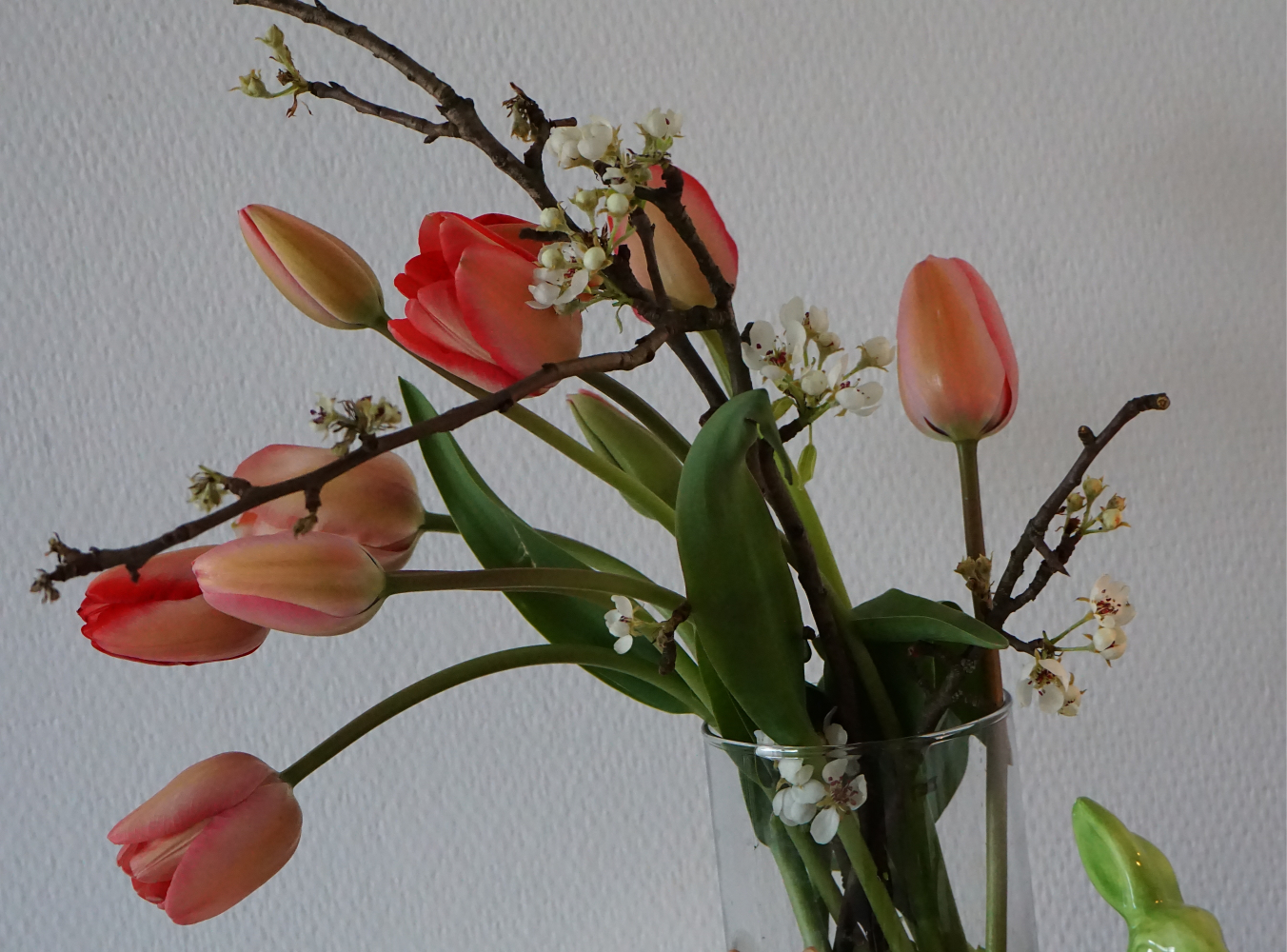 Dieses Mal habe ich die Tulpen in eine meiner Röhrenvasen mit einem Birnenzweig drapiert.